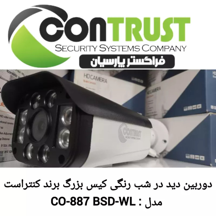 دوربین دید در شب رنگی برند کنتراست مدل : CO-887 BSD-WL برد و لنز 5 مگاپیکسل واقعی کیس فلزی مقاوم در برابر باران و گرد و غبار دارای استاندارد IP67 مجهز به چیپست تشخیص انسان و حرکت کیس بزرگ وارداتی کیفیت تصویر 1080P واقعی دارای 18 ماه گارانتی طلایی تعویض ارسال به سراسر کشور